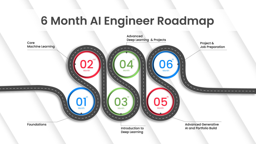 The field of Artificial Intelligence (AI) is vast and evolving rapidly. To navigate this journey, a step-by-step roadmap helps break the learning path into manageable phases. An AI engineer typically starts with strong programming and mathematical foundations, then progresses to core machine learning (ML) concepts, deep learning, natural language processing, and finally specialized applications and real-world projects.